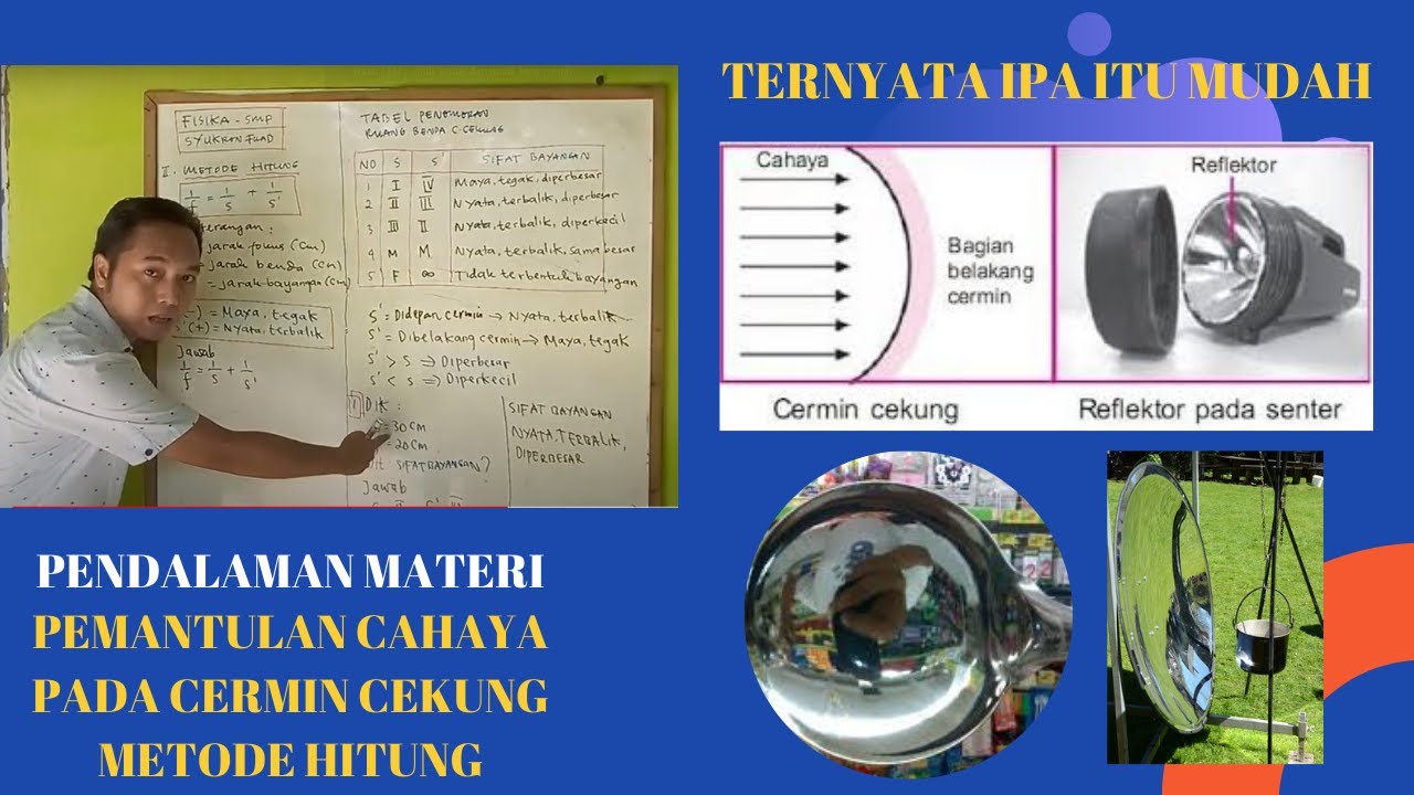 Pembentukan Bayangan pada Cermin Datar, Cekung, dan ... from materikimia.com Cermin merupakan suatu benda yang dibuat untuk memantulkan cahaya dan merefleksikan bayangan. Dalam ilmu fisika, cermin dibagi menjadi 3 jenis, yaitu cermin datar, cermin cekung dan cermin cembung. Cermin cekung atau cermin konkaf adalah cermin lengkung yang bagian dalamnya dapat memantulkan cahaya. Dari gambar terlihat bahwa tinggi minimal cermin datar l untuk dapat melukis bayangan yang dibentuk oleh cermin cekung biasanya digunakan tiga sinar istimewa. Akan tetapi, hasil akan lebih baik dan meyakinkan jika dilukis dengan tiga sinar istimewa sekaligus dengan langkah langkah. Cermin cekung berfungsi untuk memantulkan dan kemudian memfokuskan cahaya yang datang. Pembentukan bayangan pada cermin cekung. Latar belakang dalam kehidupan kita, cermin sangat berguna bagi kita.